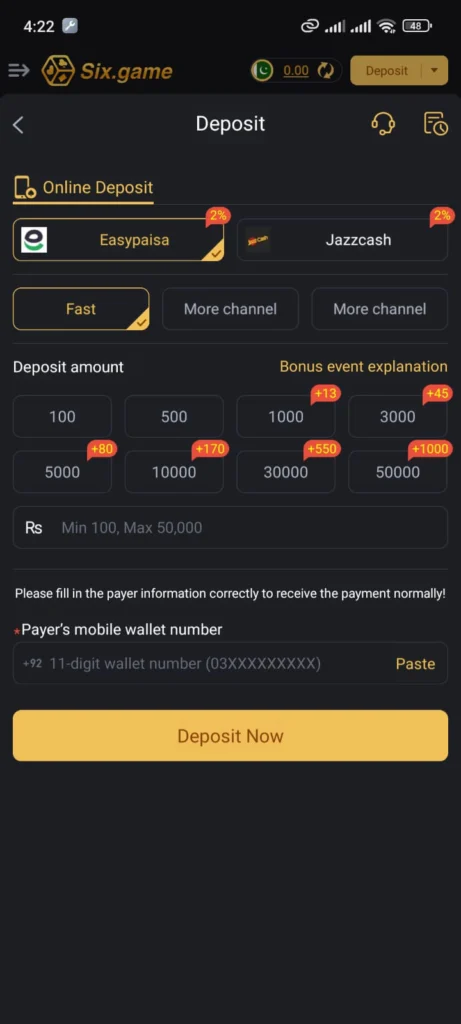 Use local payment options like Easypaisa, JazzCash, or bank transfer to add money to your Six Game wallet. The process is fast, safe, and fully secure.